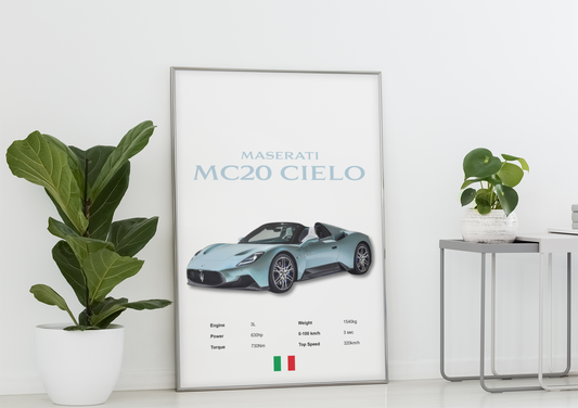 Maserati MC20 Cielo Car Poster – Dream Sports Car Wall Art, Prints & Framed Artwork