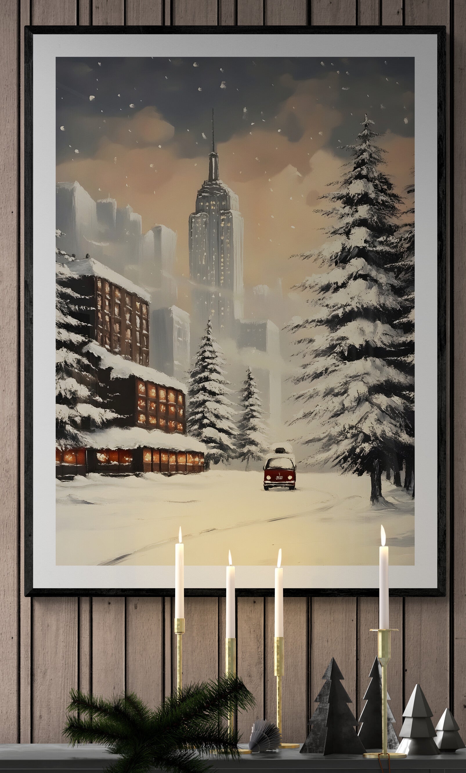 Bring the magic of the holidays into your home with Driving Home for Christmas, a cosy winter cityscape print that captures the heartwarming feeling of returning to loved ones. Featuring a snowy street lined with glowing windows, towering pines, and an iconic skyscraper rising through the mist, this Christmas wall art blends urban charm with nostalgic holiday warmth. The little red car driving through the snowfall adds a touching storybook moment, making this piece perfect for creating a festive, inviting atmosphere.