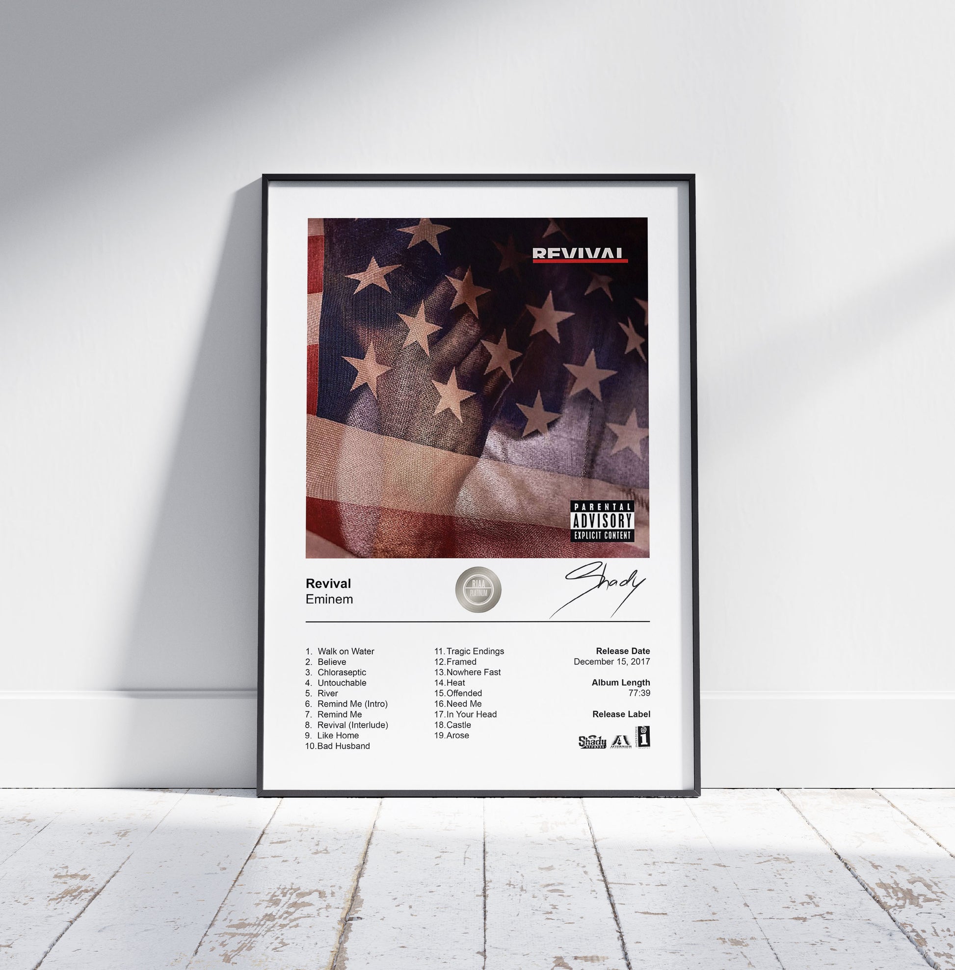 A must-have for any fan of the Revival era, this piece stands out among Eminem album cover posters for its deep themes and iconic American flag imagery. Available in both unframed and framed Eminem poster options, it’s perfect for adding a touch of lyrical intensity to any room—whether it’s a bedroom, studio, or music-themed wall.