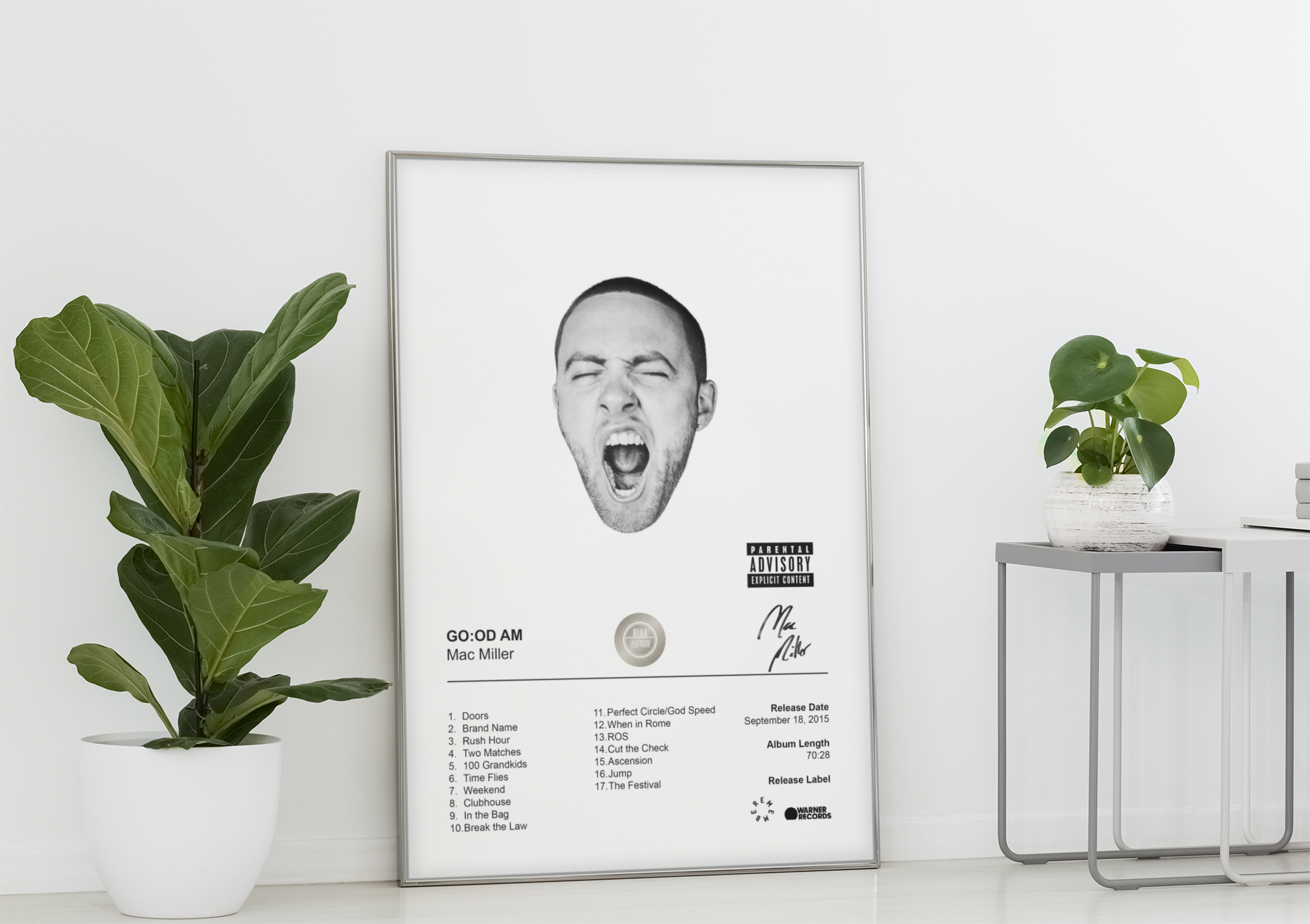 Featuring standout tracks like 100 Grandkids, Weekend, and Perfect Circle / God Speed, this GO:OD AM album cover poster captures the balance of darkness and light that defined his journey. Available in both unframed and framed Mac Miller poster options, it’s a meaningful addition to any true fan’s collection or music-themed space.