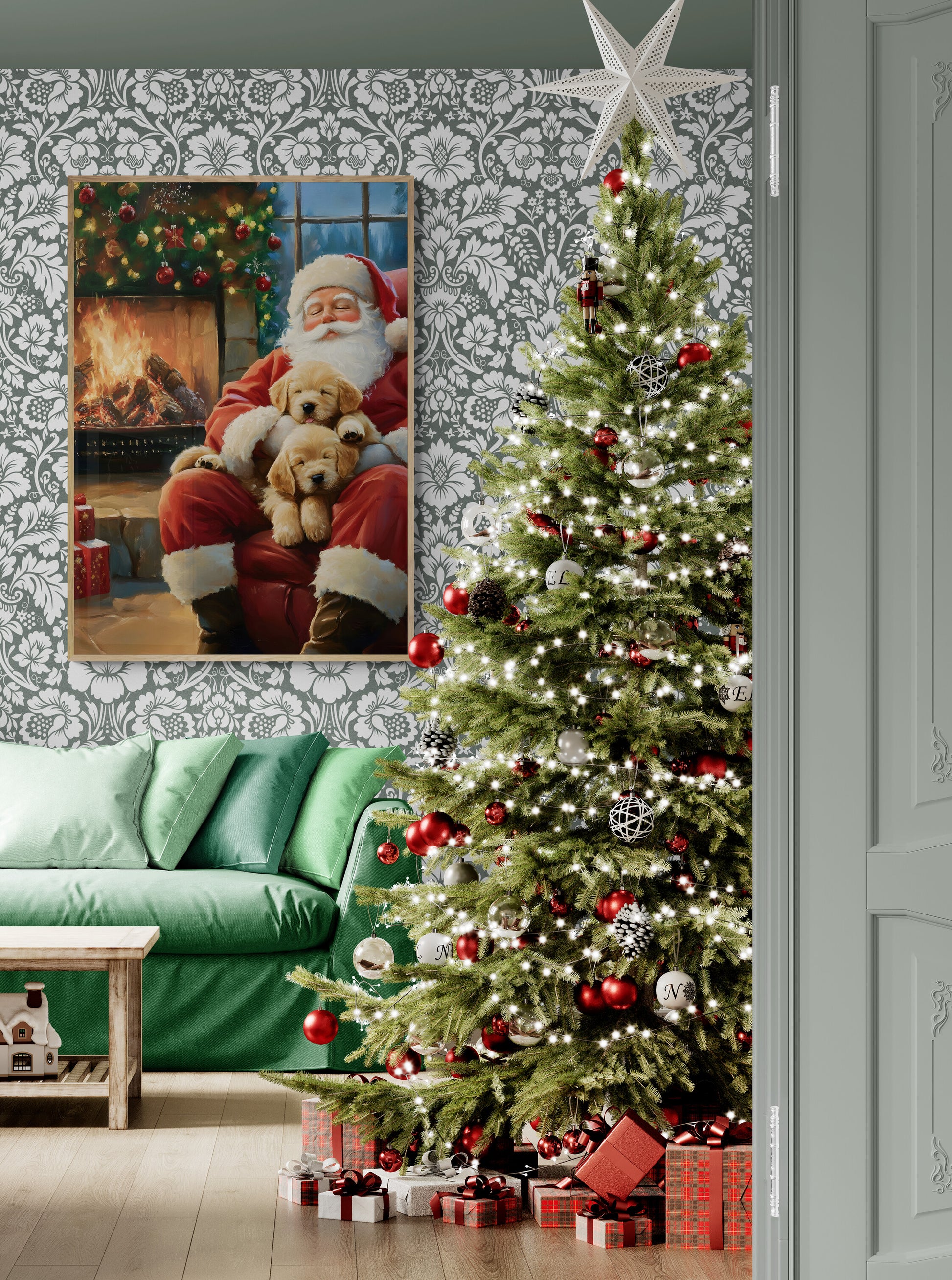 Bring cosy Christmas magic into your home with this heartwarming Santa's Little Helpers poster. Santa relaxes by a glowing fireplace while two adorable golden puppies snuggle into his arms, creating a warm and nostalgic festive scene perfect for any room.