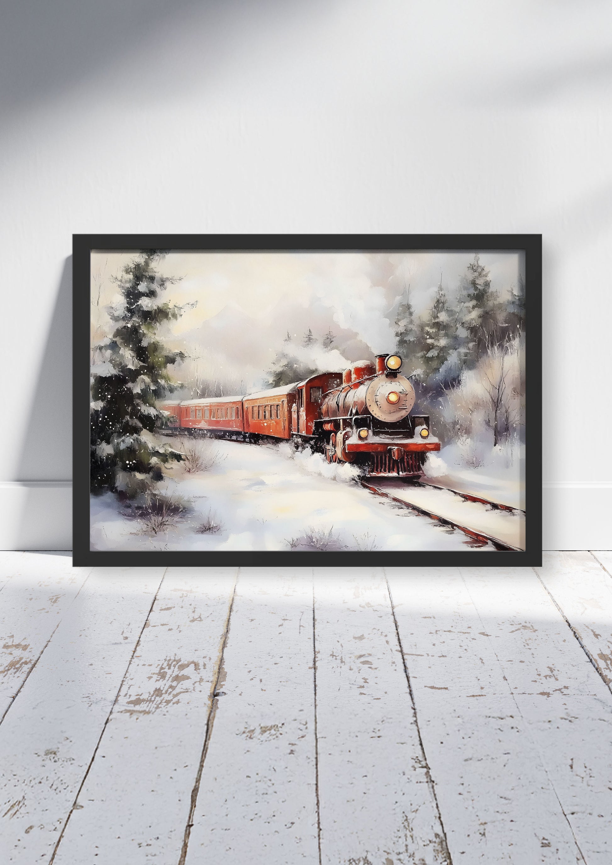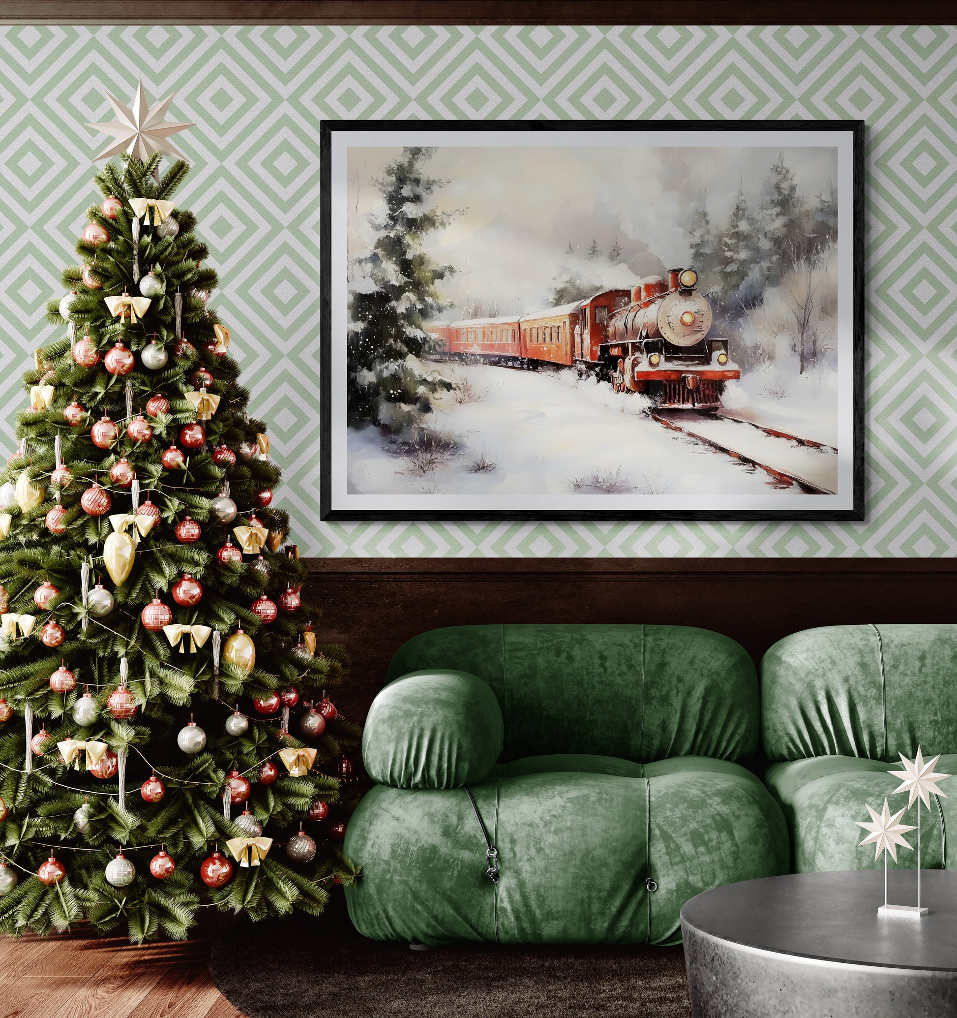 The Christmas Express captures the nostalgic magic of a snowy holiday journey, featuring a vintage red steam train powering through a serene winter forest. Warm lights glow from each carriage as soft snow drifts across the tracks, creating a timeless Christmas scene filled with wonder, warmth, and adventure. This enchanting artwork brings the charm of festive travel into your home, perfect for anyone who loves classic holiday imagery.